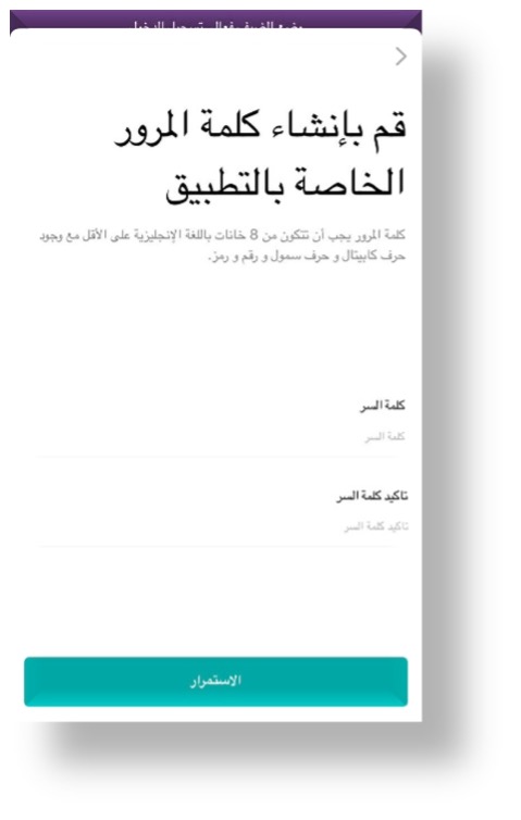 بعد ذلك قُم بإنشاء كلمة المرور الخاصة بالتطبيق ويجب أن تتكون من 8 خانات باللغة الإنجليزية على الأقل مع وجود حرف كابيتال وحرف سمول ورقم ورمز. ومن ثُم الضغط على زر الاستمرار، ستصلك رسالة لتأكيد عملية التسجيل